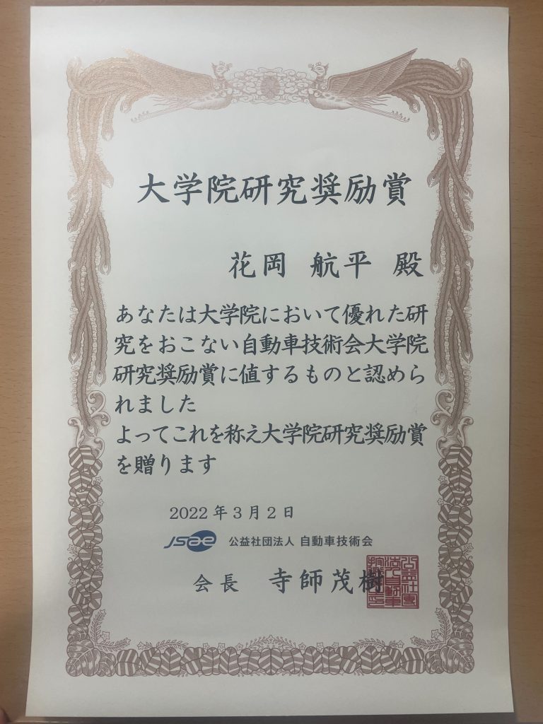 花岡航平さんが大学院奨励賞を受賞しました