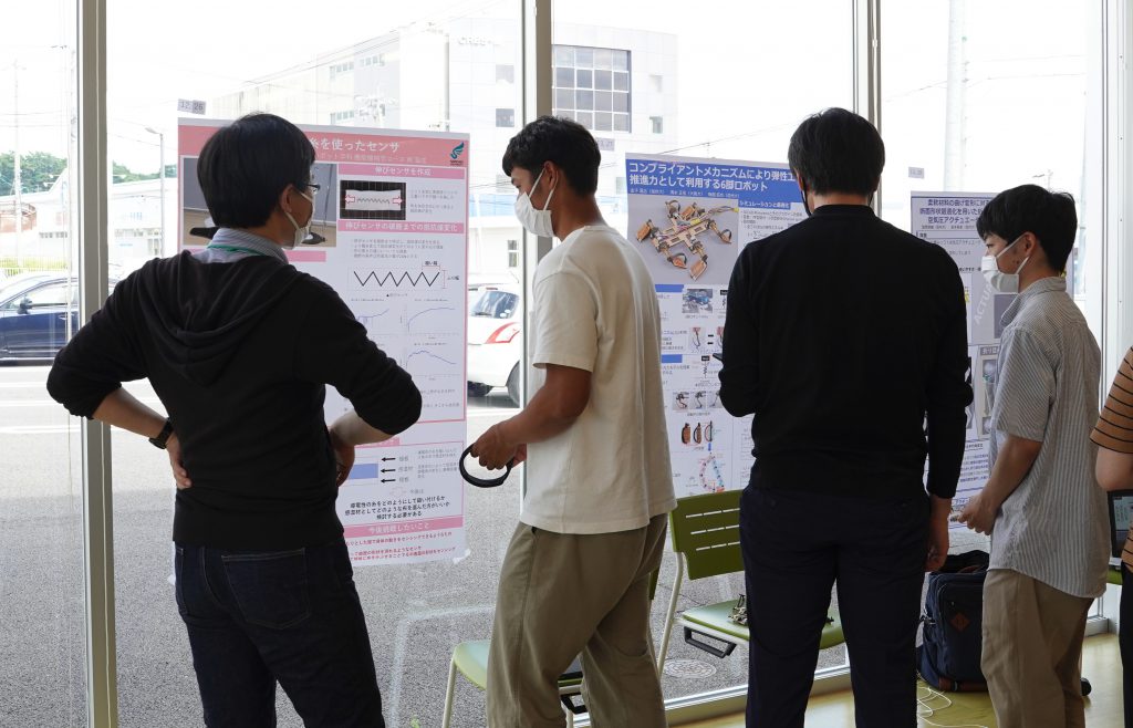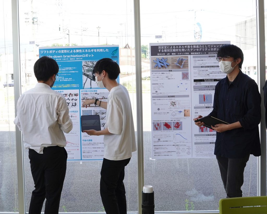 2022年6月16日 ~17日の2日にかけて,信州大学繊維学部上田キャンパスの施設OVICにて,ソフトロボット学領域会議を行いました.領域班会議の中では,信州大学繊維学部の研究室・施設見学,加えて,当新学術領域のプロジェクトに参加している研究者や学生にもポスター発表をしてもらいました.本研究室からも,下記のメンバーがポスター発表を行いました: