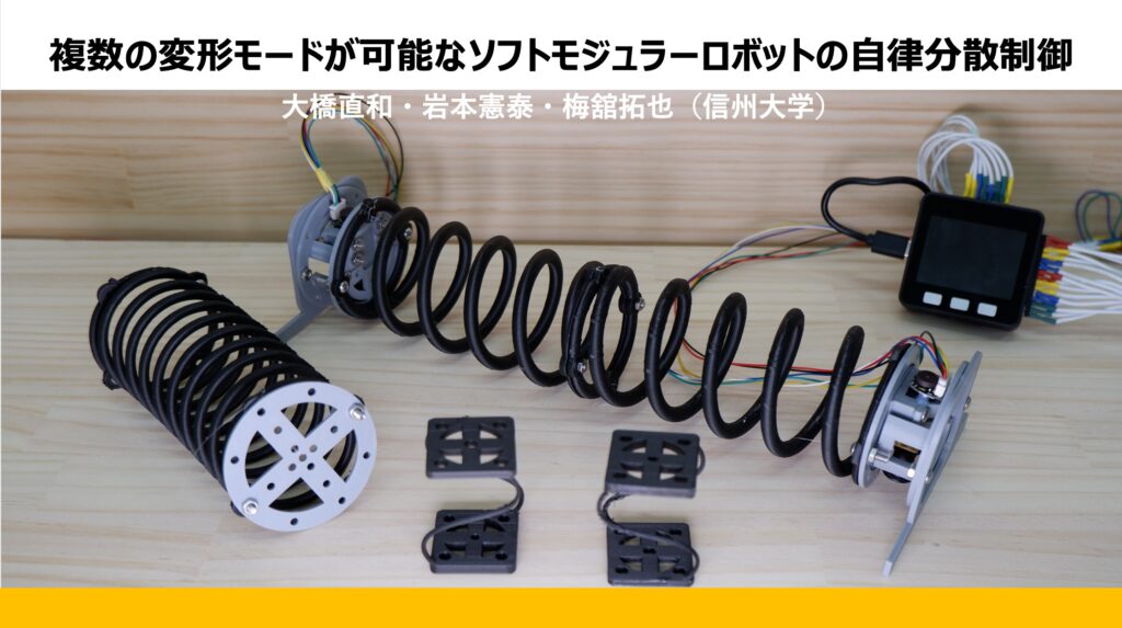 「複数の変形モードが可能なソフトモジュラーロボットの自律分散制御」, ○大橋 直和(信州大学), 岩本 憲泰(信州大学), 梅舘 拓也 (信州大学), セッション2C3:機構,モジュールロボット, 2C3-1:一般発表 15:00 - 15:30, 第35回 自律分散システム・シンポジウム, 2023年1月22-23日.