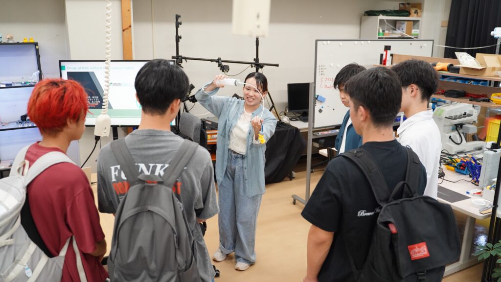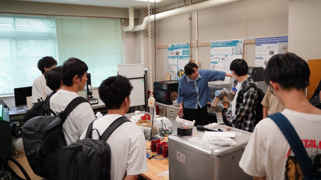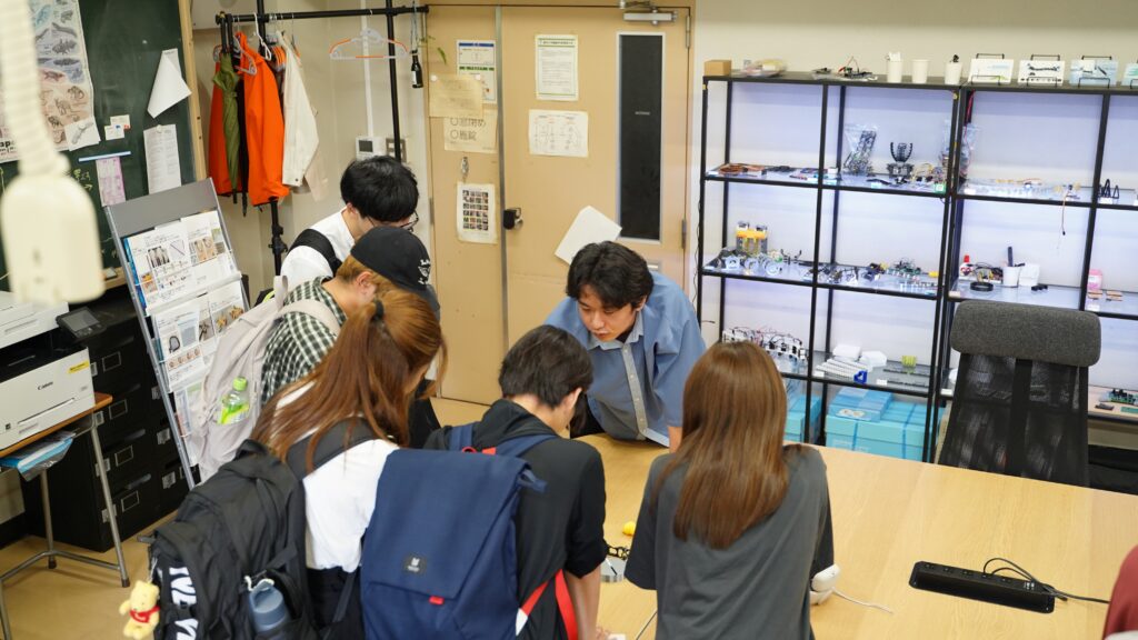 2025年8月6日に,信州大学繊維学部機械ロボット学コースの新入生向けにラボツアーを実施しました。学部4年の大澤さん・峯杉さんが研究内容や設備をわかりやすく紹介してくれました。👏 梅舘研では今までの研究(棚に展示)の説明と簡単なデモ,加えて,どのような設備があって何が作れるか?を,梅舘研に入るかもしれない新一年生に見学してもらいました.
