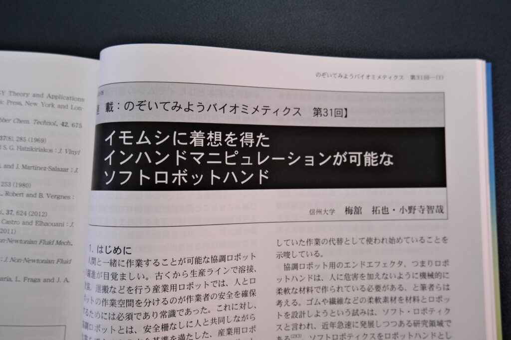 日本プラスチック工業連名誌「プラスチックス」2023年6月号 に,当研究室のディレクターの梅舘准教授が執筆した記事が掲載されました.IROS2022でも発表した「イモムシに着想を得たインハンドマニピュレーション可能なソフトロボットハンド」を解説しています(研究テーマとしての紹介はこちら).109ページから113ページの「のぞいてみようバイオミメティクス 第31回」です.ぜひ,手にとって見てみてください♪
