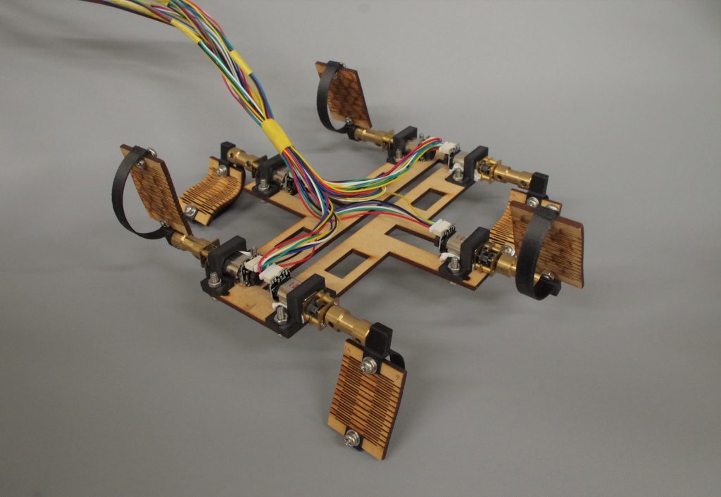 脚の設計にコンプライアントメカニズムを採用することにより,提案手法のC型の脚よりも拘束な移動運動を実現した6脚ロボット.