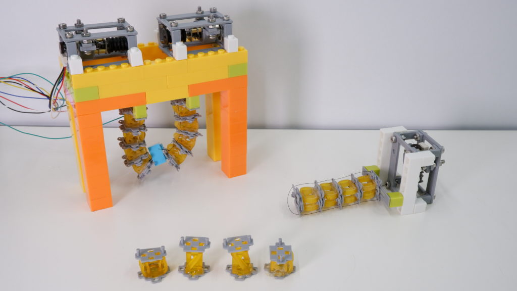 本研究は,おもちゃのブロックのように曲げ,ひねり,圧縮などの複数の変形を起こしやすいモジュールを複数組み合せ,それらを腱駆動してユーザーが複雑な変形を自由に作り出せるようにシステムを設計しました.本研究は,大橋直和くんが主体的に取り組んでいます.