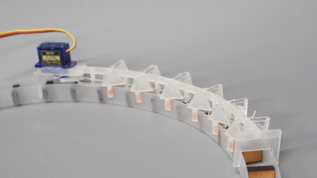発表概要:本研究では,双安定構造を数珠つなぎにした格子構造を用いて,単一のアクチュエータで駆動し這行するイモムシ型ソフトロボットを提案した.双安定格子を伝った変形波の伝搬により,このロボットは単一のアクチュエータで這行運動を実現する.本研究では,2つの安定状態間のエネルギー差を持つ双安定構造と,リセット機構により,繰り返し波の伝搬が可能となった.また,ロボットの背骨に当たる構造を柔らかく設計する,曲がったレールに沿って這行運を行うことができることも示した.ロボット実機(試作機)の実験結果から,直線,曲線,登り斜面のレールの上を移動可能であることを示した.